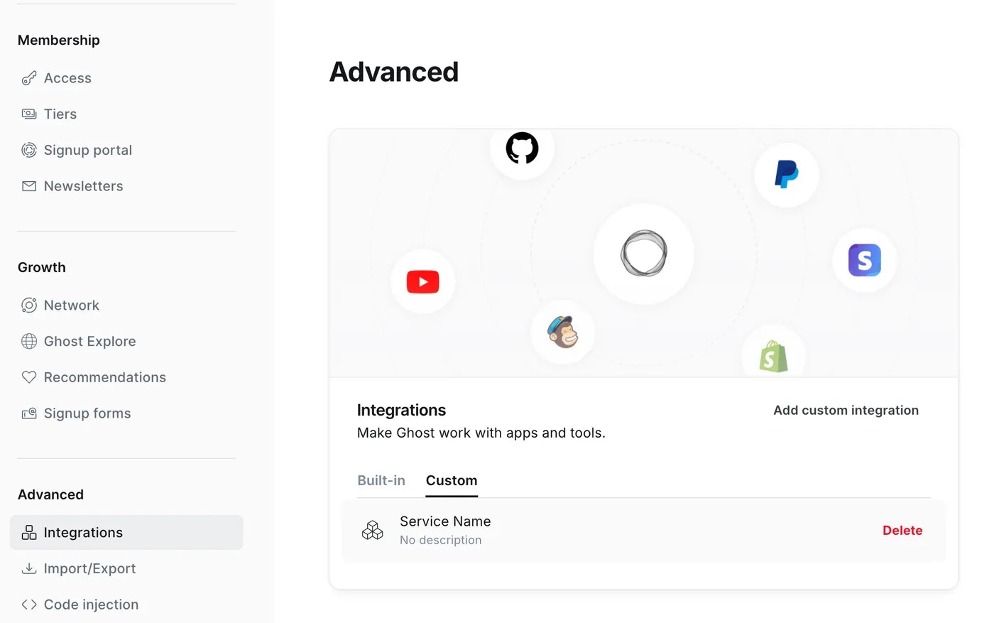 There are three methods for authenticating with the Admin API: integration token authentication, staff access token authentication and user authentication. Most applications integrating with the Ghost Admin API should use one of the token authentication methods. The JavaScript Admin API Client supports token authentication and staff access token authentication.Choosing an authentication method
