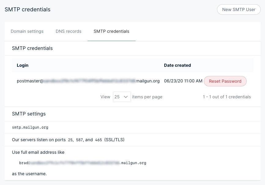 Once your site is fully set up create a Mailgun account. After your account is verified navigate to Domain settings under Sending in the Mailgun admin. There you’ll find your SMTP credentials.
