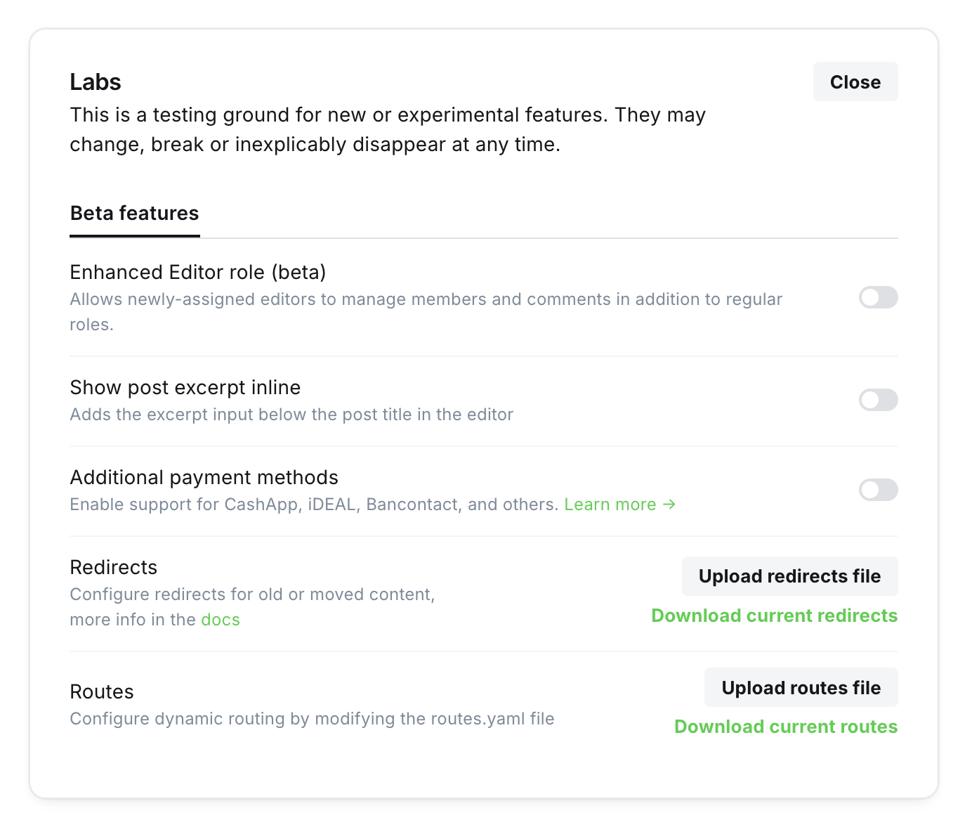 From the Labs page, click Download current redirects to get your redirects file. This will be calledredirects.yaml (or redirects.json depending on your Ghost version). If you’re using custom routes, click Download current routes.yaml to get your routes.yaml file.