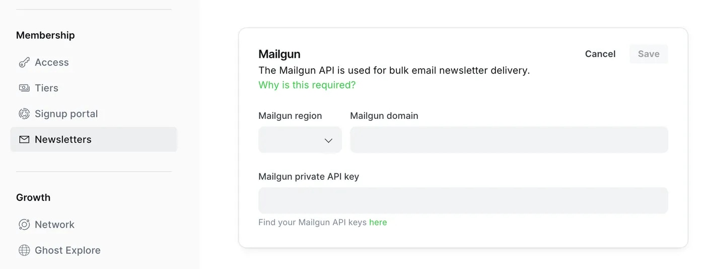 Self-hosted Ghost installs can configure bulk email by entering Mailgun API keys from the Email newsletter settings. Delivering bulk email newsletters can’t be done with basic SMTP. A bulk mail provider is a requirement to reliably deliver bulk mail. At present, Mailgun is the only supported bulk email provider. Mailgun is free for up to 600 emails per month, and has very reasonable pricing beyond that. More info here