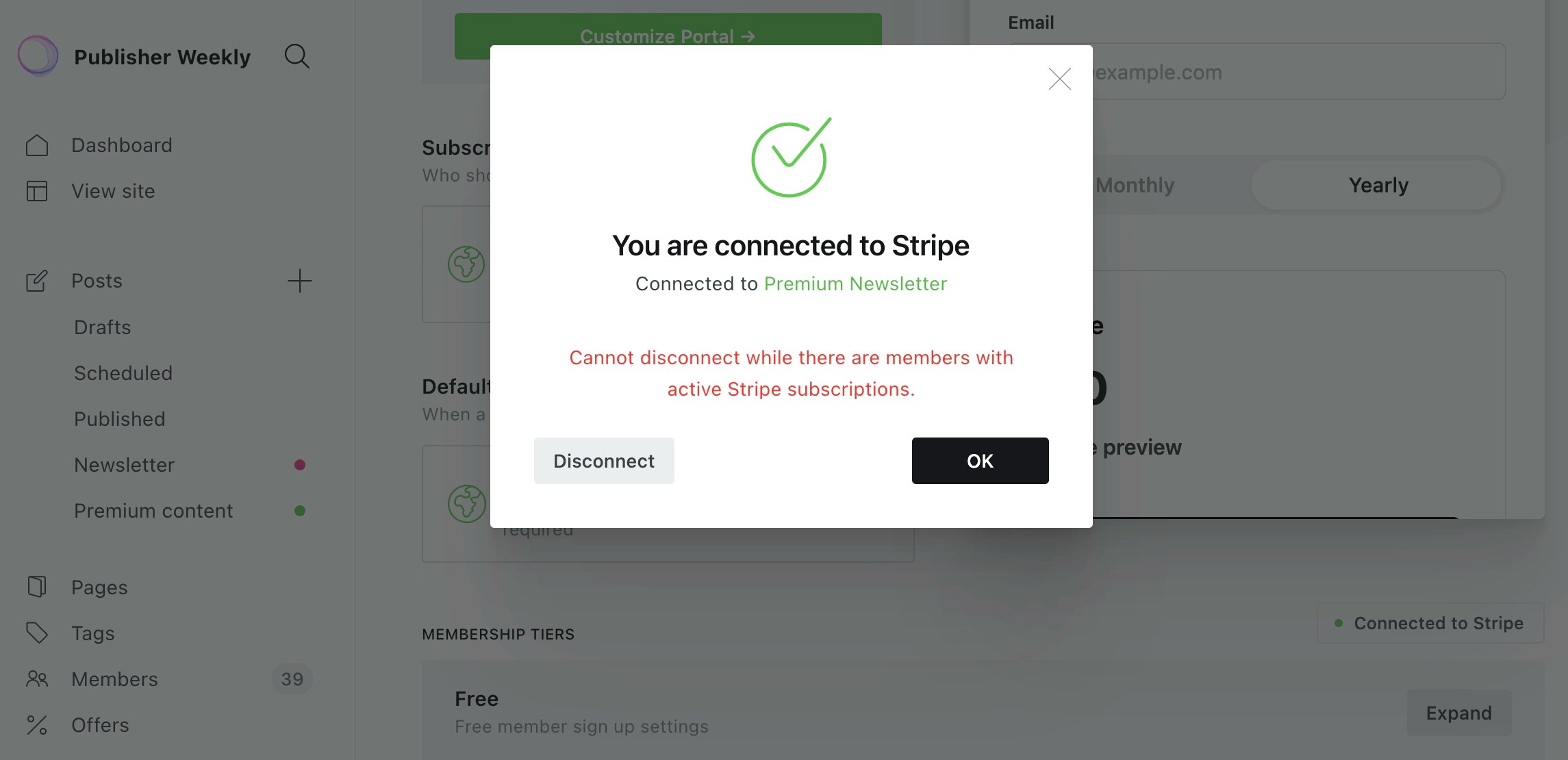 Skip this step if your Ghost site is not connected to Stripe. If you have Ghost connected to a Stripe account in Live mode, it needs to be disconnected in order for you to be able to reconnect on your new installation.