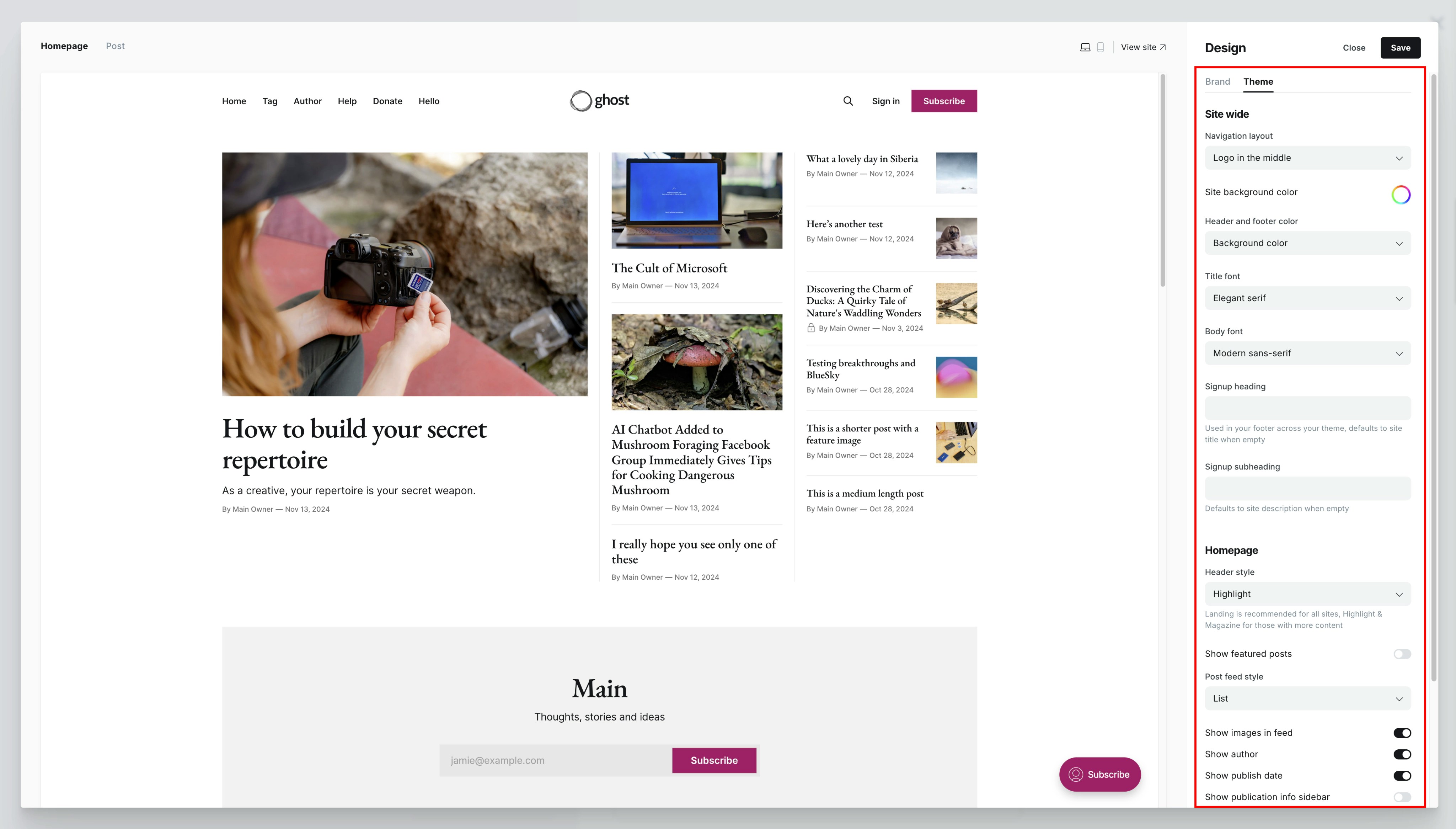 Theme settings fall under the Theme tab in Design & branding, and are grouped into one of three categories:- Site wide
