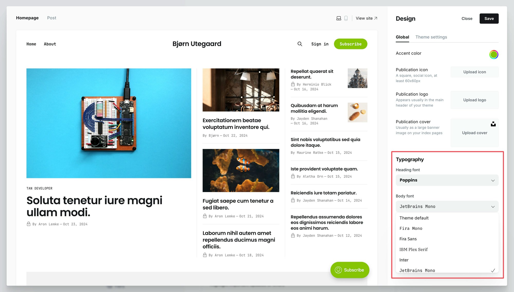 Custom fonts allow users to select heading and body fonts for their themes from a curated list. This provides the user with a broad range of font styles so your theme can appeal to a wider audience.