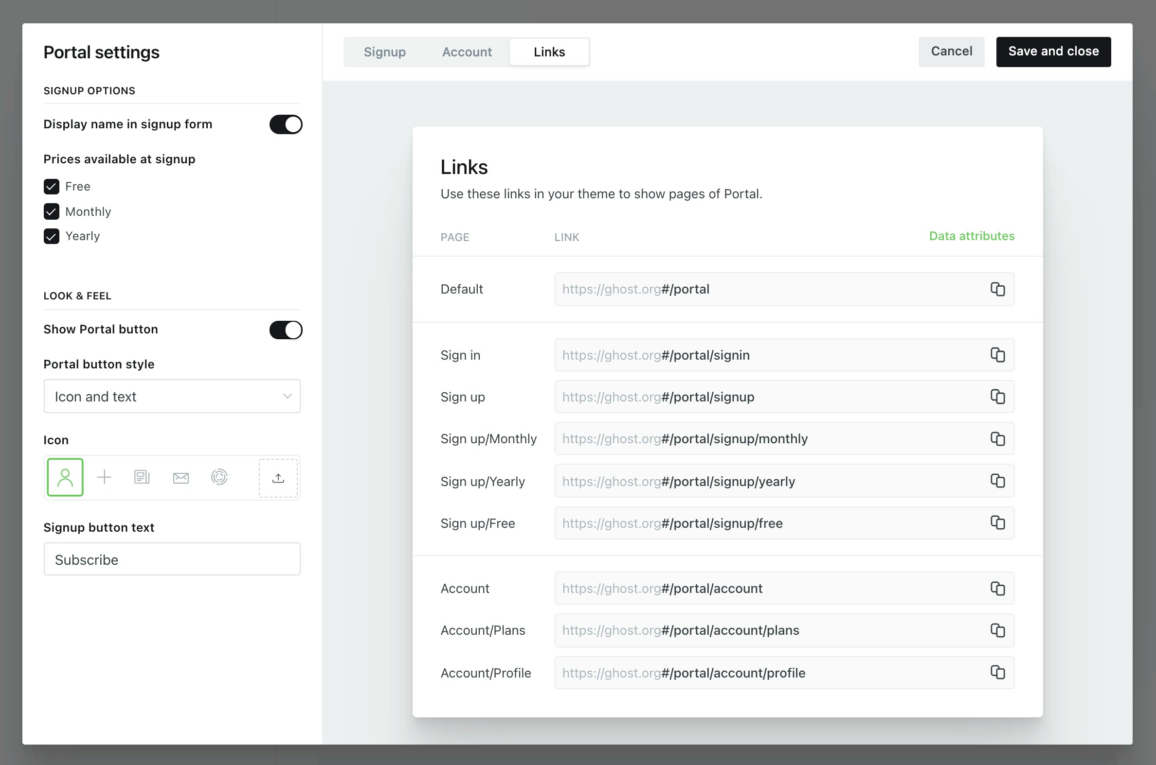 There are currently two types of plans for each tier in Members: monthly and yearly. Find out how to connect a Stripe account.. Once Stripe is properly configured, it’s possible to direct visitors to a Stripe payment form pre-filled with the selected plan, by adding buttons with thedata-portal attribute pointing to monthly or yearly price of a tier. The data attribute for monthly/yearly plan of a tier can be fetched from Portal settings in your Admin URL - /ghost/#/settings/members?showPortalSettings=true.